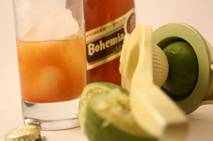 Cut the lime in half. Rub one half over the rim of a large (16-ounce) beer mug to moisten it. Invert the mug and dip lightly in the salt. Fill the mug half full with ice, then add the lime juice, Worcestershire and hot sauce. Fill the mug with beer, stir just enough to combine everything, then enjoy.