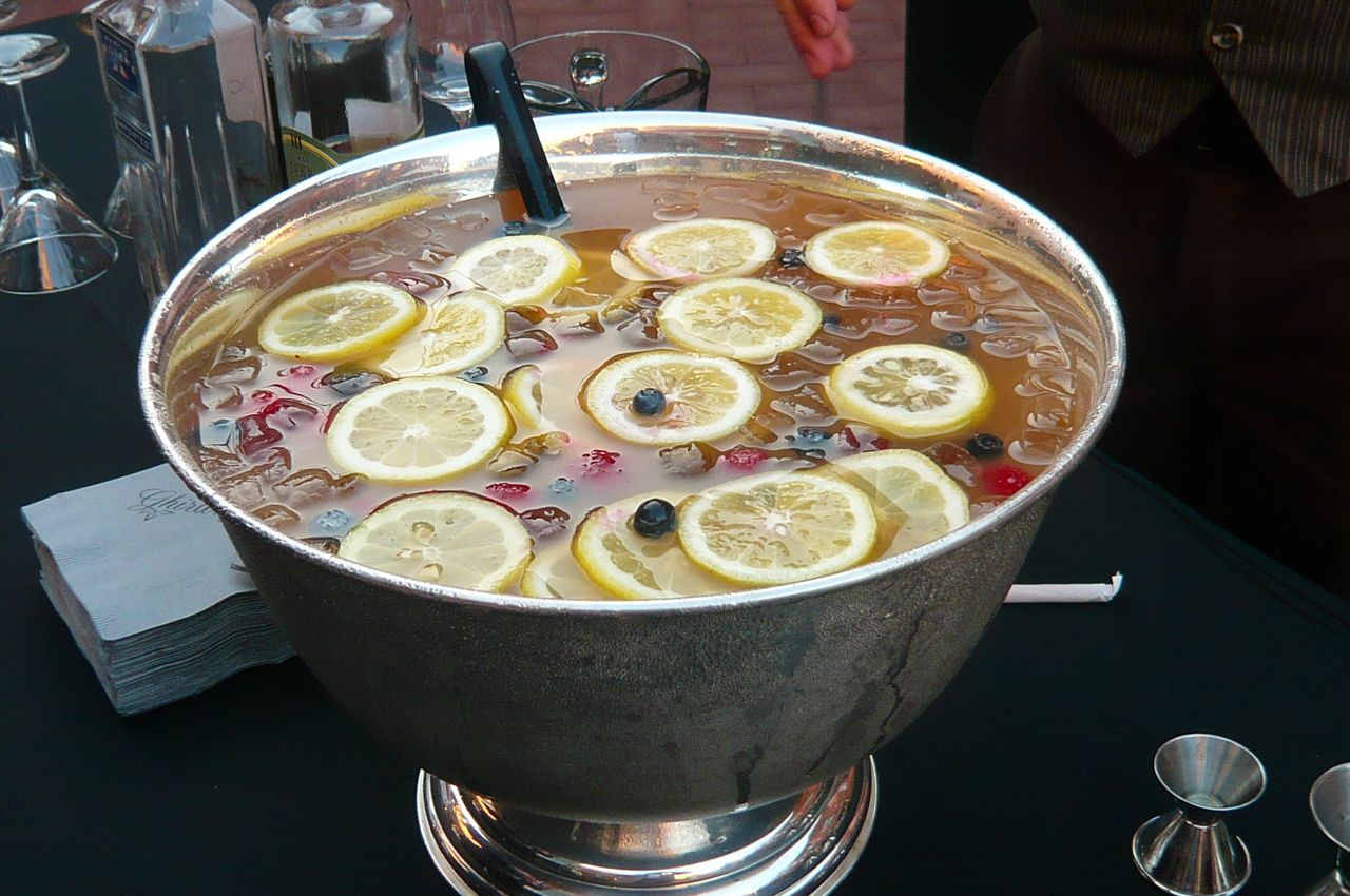 Combine all liquids in a punch bowl and stir. Add lemon wheels and fruit (depending the season you could use vagarious berries, peaches, apples, pears). Serve over ice in a punch cup. Serves 8–10. (Tip: chill all ingredients prior to making your punch!)